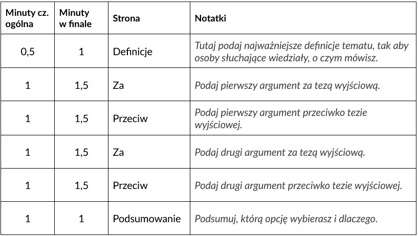 - finaliści debatują na ten sam temat (kolejność wystąpień: najpierw 2. miejsce, potem 1. miejsce)
